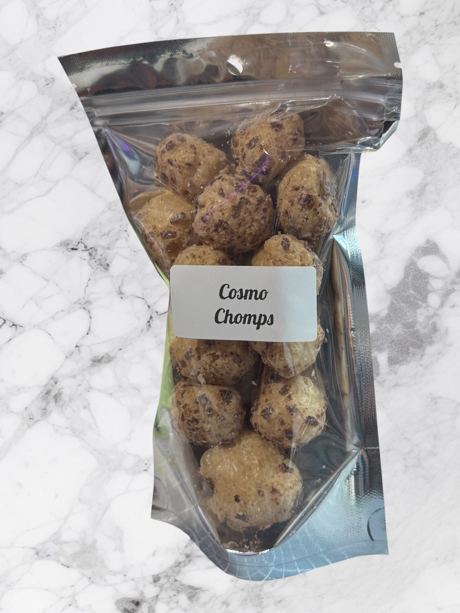 Prepare for a cosmic journey with Cosmo Chomps! These freeze-dried caramel and chocolate bites are a galactic twist on your favorite classic treat. With rich, buttery caramel wrapped in smooth chocolate, each bite is out of this world. The freeze-drying process transforms them into a delightfully crunchy, light snack that lets you enjoy all the creamy, chewy goodness with an exciting new texture. Perfect for snacking anytime, Cosmo Chomps are the perfect way to satisfy your sweet tooth and take your taste buds on a thrilling ride through the stars!